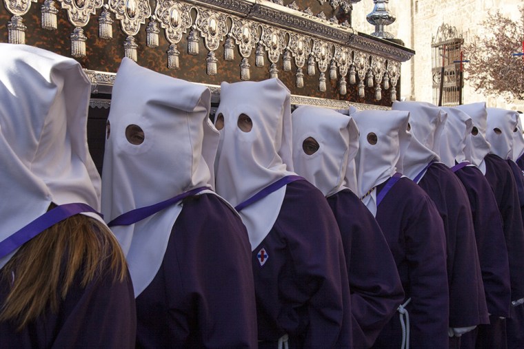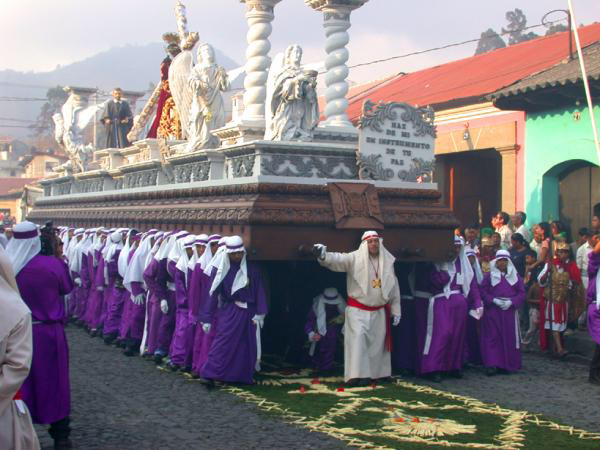 Darkness fell over the city, as different Catholic churches paraded their dead statue of Christ, concealed in a glass coffin. It was Friday night, the time for grieving, as they proceeded to the place of burial. They shoved the eager crowds back. Candles were passed out, along with written prayers to be recited. The death march began with hundreds of men that resembled the Klan, wearing black and white hoods. They were lead by the priests who were swinging smoking incense throughout the street. It was considered an honor to carry the heavy procession barges, weighing 1,700 pounds, displaying the seven cries of Christ.