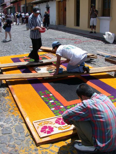 I stood in the doorway of the church, watching the people gather in the street to look at the beautiful display of street carpets (alfombras) made from flowers and colored sawdust. What took hours throughout the night to create, would soon be trampled by the Catholic processions. It was Holy Week (Semana Santa) and thousands gathered from around the world to participate in the three days of Easter celebration.