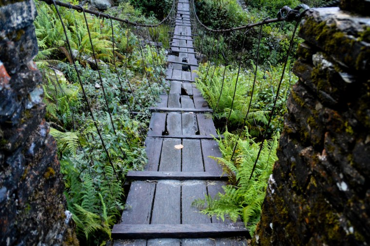 Wooden hanging bridge in a trekking route to Annapurna Base Camp